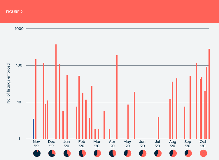 If the seller had been stopped from using the marketplace after 3 listings were reported and removed, at least 2,060 of the seller’s infringing listings would not have required enforcement (see figure 2 below).