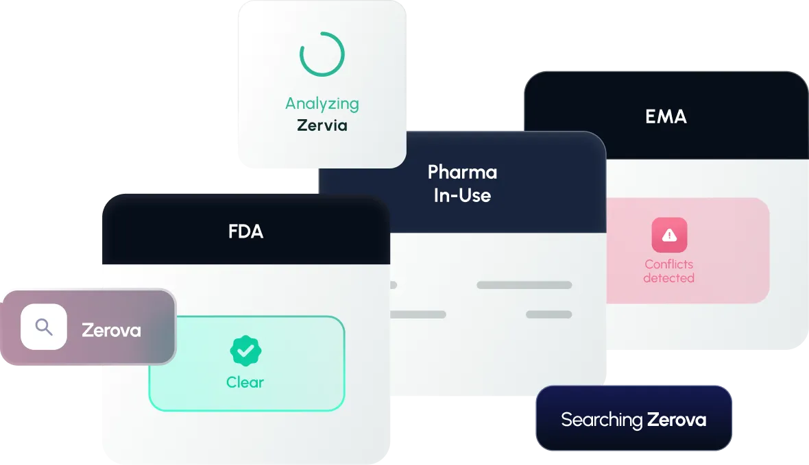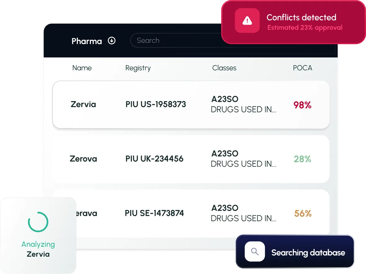 Search across global trademarks, pharma-specific sources (PIU, INN/USAN, marketing authorizations), and get results scored in real time.