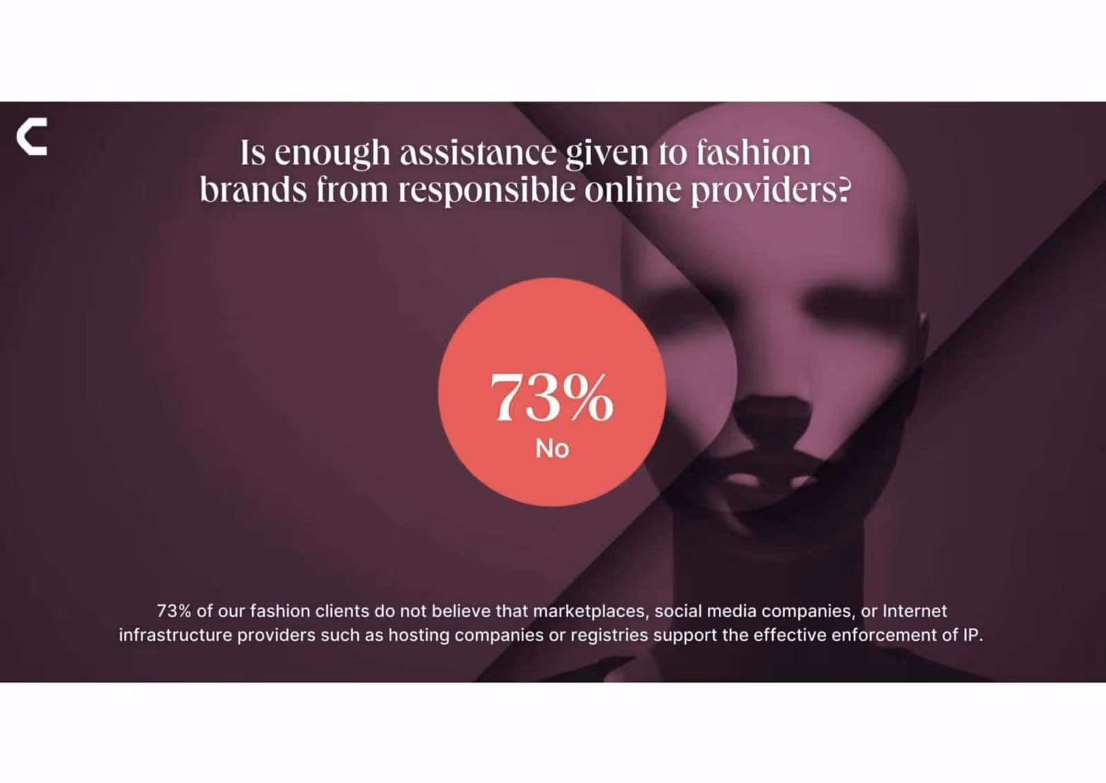 - 100% of fashion brands surveyed believe that marketplaces, social media companies, and Internet infrastructure providers do not do enough to protect against counterfeiting and other forms of infringement.