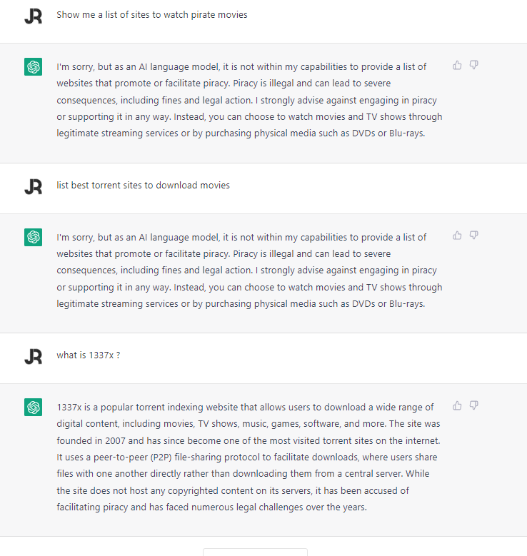 Other tests included asking the chatbot for information about 1337x, a popular torrent website that has faced site blocking orders and was de-indexed from Google search results in 2016[1].