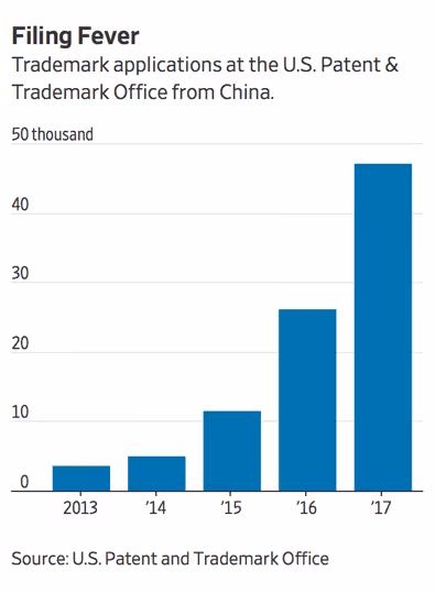 US trademark applications from China have grown “more than 12-fold since 2013,” totaling more than all filings from Canada, Germany, and the UK. What’s behind this huge increase? “Cash incentives,” writes The Wall Street Journal.