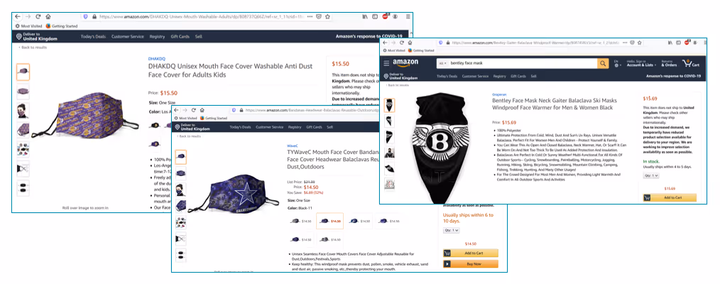 Brands otherwise unrelated to COVID-19 and hygiene are equally targeted by bad actors intending to capitalize on increased demand for hygiene goods, such as these fake face masks seen below.