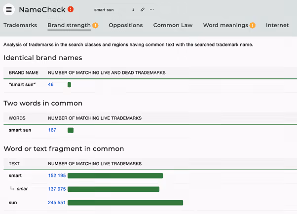 Namecheck’s Brand Strength Tab is helpful in giving a sense of the relative uniqueness of a mark: for example, the strength of different words within a multi-word candidate.