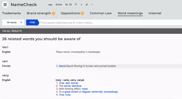 An example of these features can be seen when searching for the mark VERI in class 32 (light beverages) and class 33 (alcoholic beverages, except beer) which reveals the following top word results: