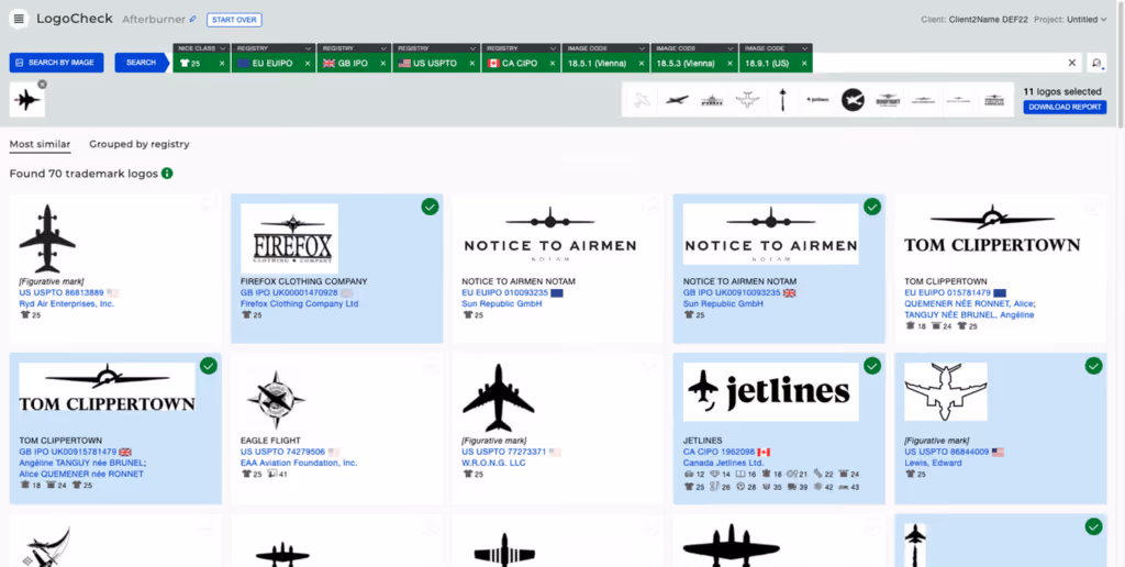Then, you can upload your responsive logos in succession to check for similar logos using image recognition. This allows you to research trademark details and the trademark portfolios and litigiousness of potential opponents, selecting logos into your report as you go.